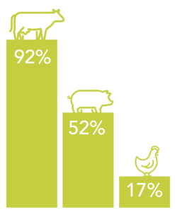 养牛行业全球市场总体碳足迹预测远低于当前畜牧系统碳足迹:约92%比牛肉低52%比猪肉低17%比鸡肉低17%
