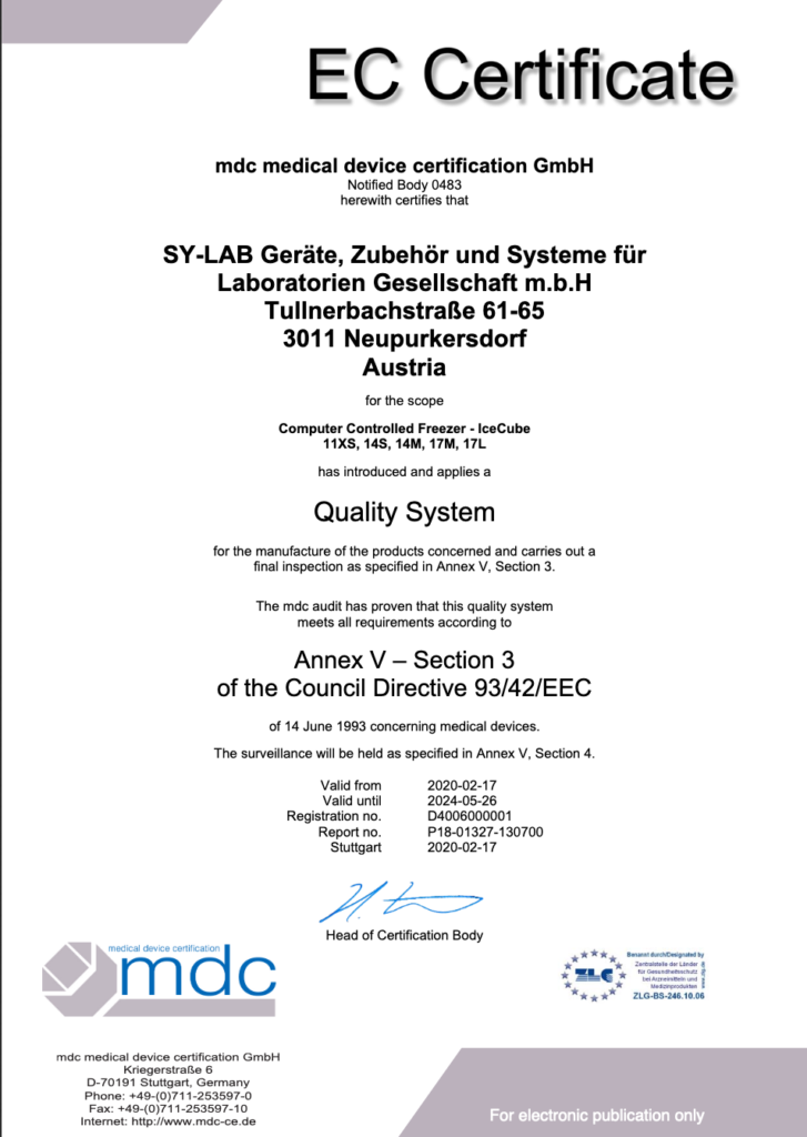 经医疗产品认证(IIa类)的SY-LAB速冻机 2020年5月26日 新闻,Sy-lab 我们很高兴地宣布SY-LAB已经根据MDD(指令93/42/EEC)附件V成功获得了他们的QA证书,因此能够在欧盟区提供作为医疗产品IIa级的冰立方冰箱。